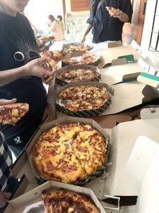 Oud en nieuw is iets waar de meisjes altijd erg naar uitkijken. Ze hebben zin in het lekkere eten, Mukata oftewel Thaise barbeque, en de spelletjes, het dansen, de karaoke en als het meezit ook nog wat kindervuurwerk. Als er dan ook nog op heerlijke stukken pizza wordt getrakteerd door de coach en zijn vrouw, dan heb je zeker allemaal blije meisjes. Het is geweldig om te zien hoe ze kunnen genieten van lekker eten, ze doen het rustig aan en eten de hele avond door met tussendoor al die andere leuke dingen.