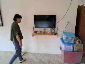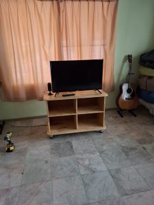 Helaas hebben we hier geen donaties voor ontvangen, maar doordat we hout over hadden van een andere klus, hebben we toch nieuwe kasten kunnen maken. Een van de huizen wilde niet meer een heel meubel, maar alleen een plank onder de televisie, dus dat scheelde in materiaal. Het feit alleen al dat de oude meubels weg waren, was al een verbetering, maar het is ook mooi om te zien dat er iets nieuws voor in de plaats is gekomen.